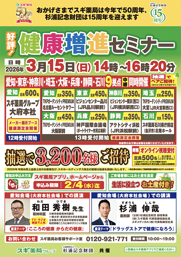 大好評の健康増進セミナーが2026年3月15日(日)に愛知・東京・神奈川・埼玉・大阪・兵庫・静岡・石川の9拠点で中継同時開催いたします。(愛知(大府会場)以外はオンライン中継となります。)